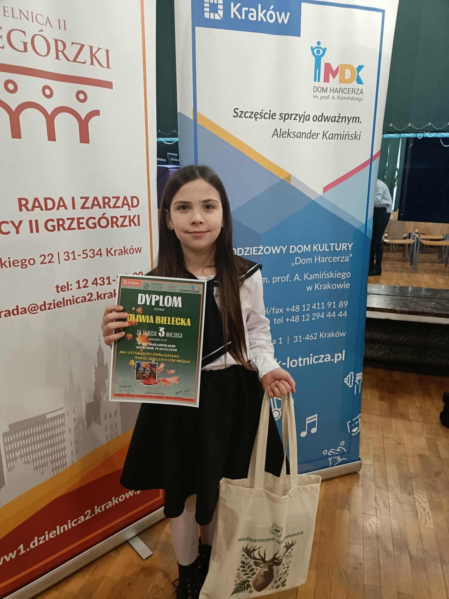 W dniu dzisiejszym nasza uczennica, Oliwia Bielecka z klasy IIa uczestniczyła w gali zwieńczającej ogólnopolski konkurs plastyczny pt. “Miło jest chodzić po leśnych ścieżkach (…)” organizowany przez Młodzieżowy Dom Kultury-Dom Harcerza w Krakowie. Gorąco gratulujemy Oliwce zdobycia 3 miejsca. 🎊🫶👌 Brawo!!!👏👏👏